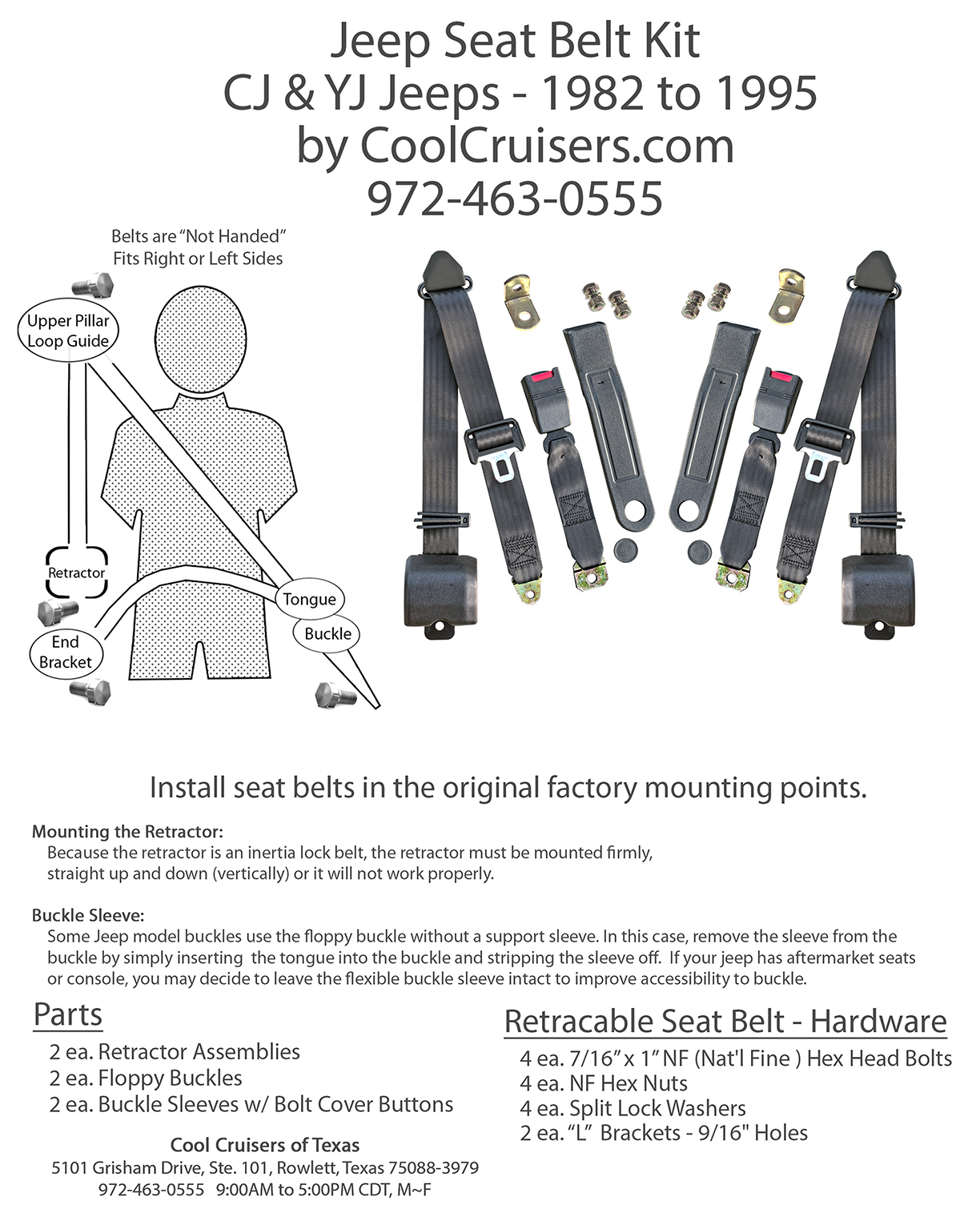 • 3-Point Seat Belt Kit fits Jeep CJ-5 ('77-'83), CJ-7 ('82-'85), CJ-8 ('81)