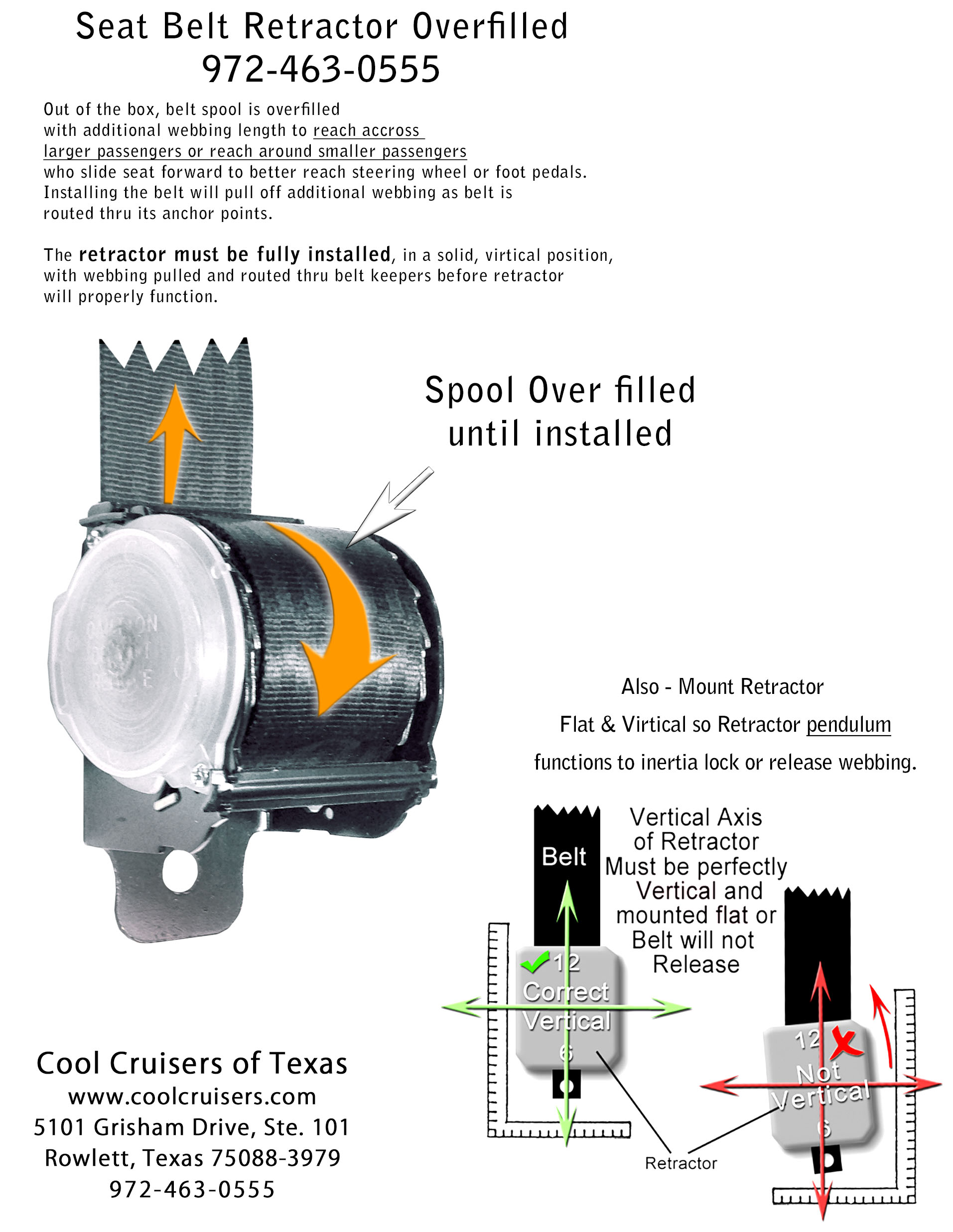 Mount seat belts perfectly vertical and flat, otherwise retractor will not lock as designed.