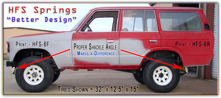 HFS Springs are engineered slightly longer to push shackles out and away from axels allowing shackles to swing as springs flex. Proper spring shackle angle creates a much softer ride, reduced leaf stress and improves spring durability.